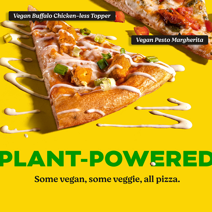 Buffalo sauce, topped with dairy free mozzarella, plant based crispy chicken, green onions, and drizzled with dairy free ranch.